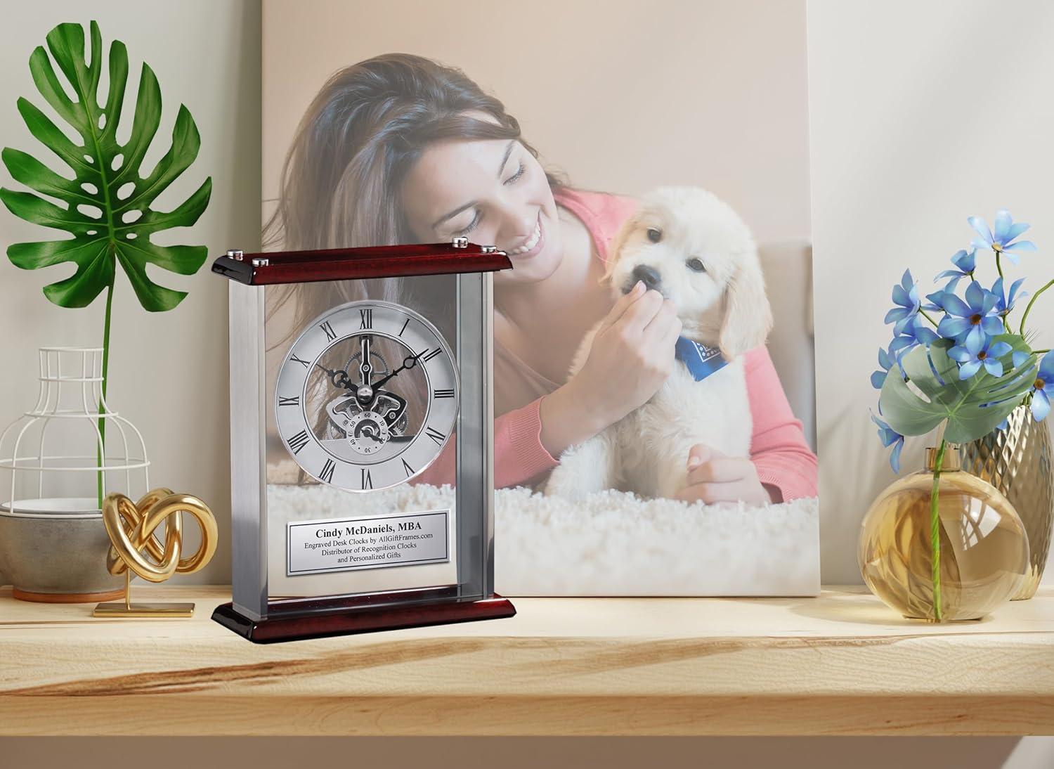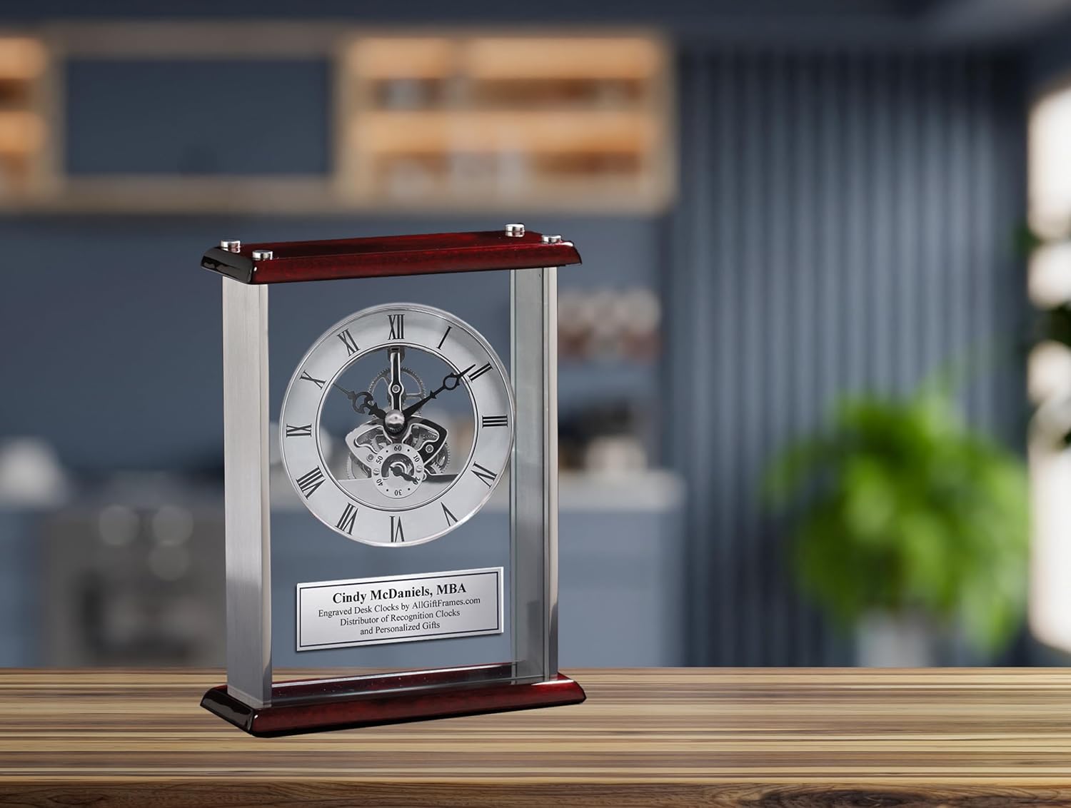 Offering employee appreciation and retirement awards such as personalized desk clocks, crystal clocks and plaques. Engraved clocks for anniversary, retirement, recognition and employee service award. When purchasing an award for your employee or retiree, consider the importance of the award. A personalized engraved clock gift is useful and usable as employee service awards. This desk clock can be a great retirement gift as well. Promotional Clock Employee Recognition Corporate Desk Clocks Executive Corporate Gifts Choose from our robust selection of fine personalized promotional corporate gift items fit for any employee or executive with any lifestyle. Nothing shows your admiration more than a corporate clock logo gift with the extra touch of personalization. These clocks are unique business corporate gift for holiday and Christmas gift. We also offer corporate gift service which includes apparel business promotional products items, advertising specialties, promotional gifts custom imprinted promotional product glass plaque gift idea. These corporate promotional clocks are great corporate gift ideas and business holiday Christmas gift for retirement, executive and employee incentive Large Silver Da Vinci Dial Desk Clock Encased in Glass and Chrome with Wood Cherry Top and Base. Personalized this Engraved Desk Clock with Silver Engraving Plate. Clock size 10" H X 7.25" W.