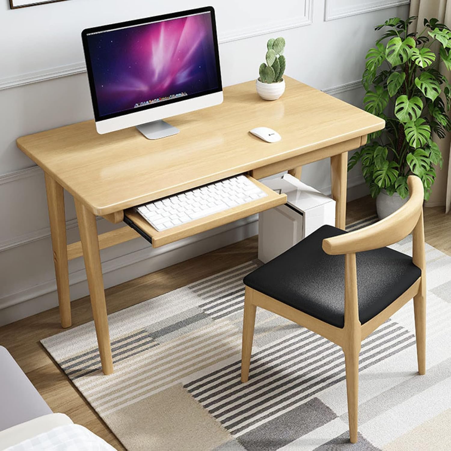Writing Desk with Drawers Solid Wood Desk Computer Desk Study Desk Home Office DeskThe whole desk made of rubber wood is hard and durable,which has great bearing capacity.Generous in size,this desk offers a spacious top surface and includes a keyboard tray for added convenience.Drawers provide plenty of space for small office supplies.Working from home office or den never felt so good!Package includes:1x Computer DeskStorage DrawersDrawers for storing study or work tools offers you neat desktop.Keyboard TrayThe sliding keyboard tray is provided with steel balls for smooth utilization.Easy AssemblyOur writing desk is easy to assemble,contains screws,tools and instructions required for installation,no additional tools are required.Follow the assembly steps to complete easily within 20 minutes.